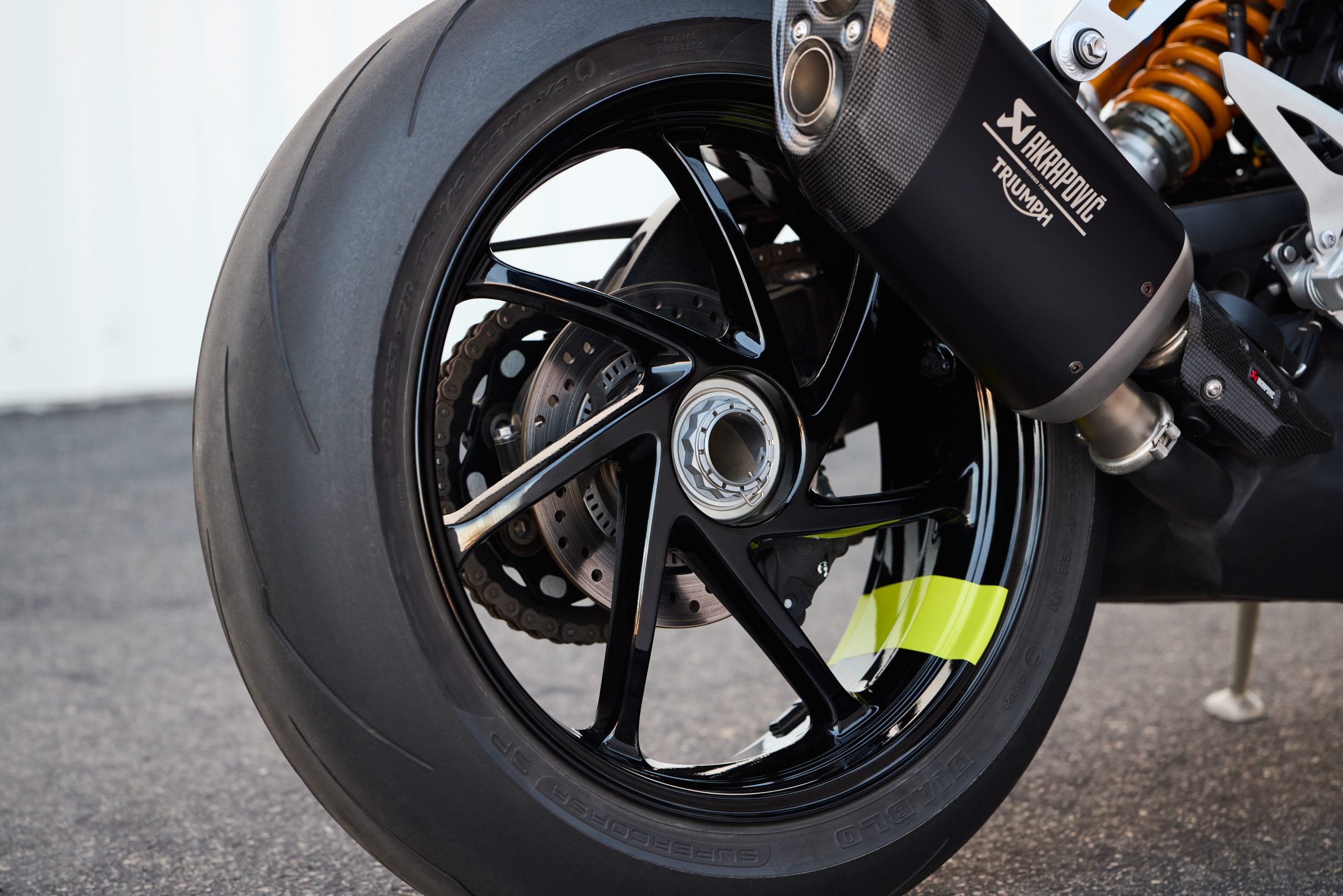 In fact, the limited-edition RX model is one of the most plastic-free nakeds on the market, not just because it has more minimal bodywork than much of the competition, but also because much of that bodywork is made of carbon-fiber, not ABS or fiberglass or whatever they’re making standard fairings from these days. The front fender and some other pieces are made of the lightweight material, but take note that Triumph still claims a 439-pound curb weight for the RX, more-or-less the same as other Speed Triple models, which lends credence to our suspicion that most weight figures published are approximations anyway. Even the Akrapovic muffler, certainly lighter than the stock unit, did not turn this into a Skinny Minnie Miller machine.