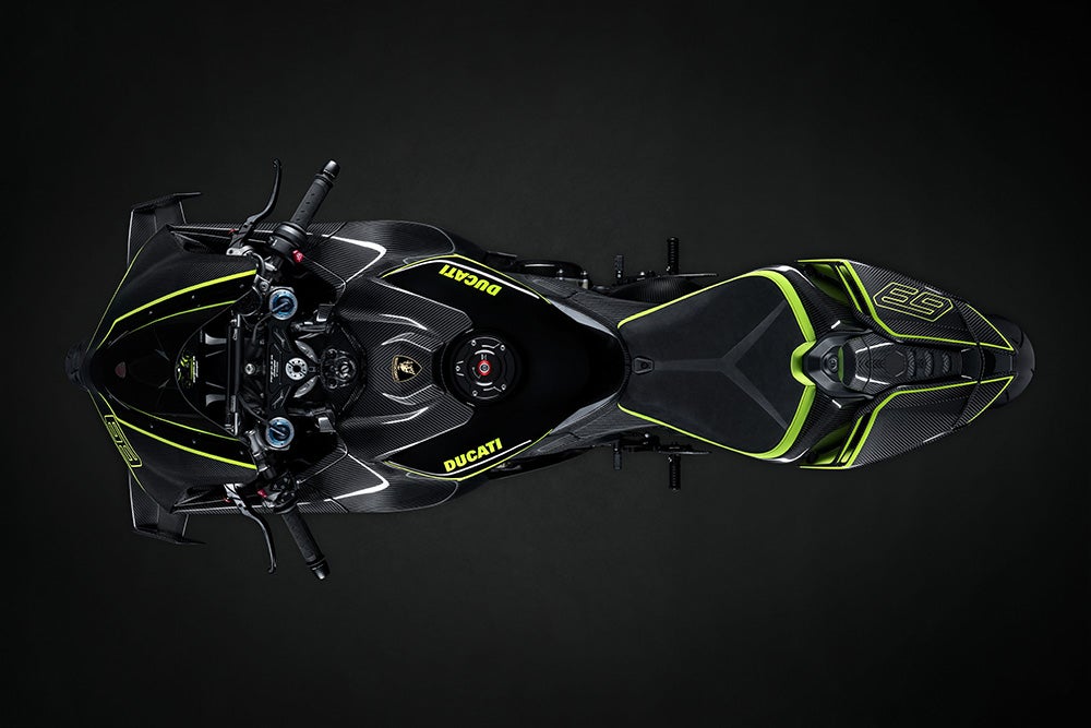 Using the Lamborghini Revuelto for inspiration, Ducati’s Centro Stile collaborated with Lamborghini Design to develop the livery and other facets of the V4 Panigale Lamborghini’s makeup. The bike’s forged aluminum wheels are the same style as those found on the Revuelto. Ducati also reworked the the tailpiece and wings to follow the lines of the Revuelto.