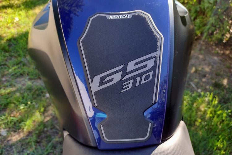 I was already starting to see scuffs in the paint where my jacket zipper makes occasional contact, so tank pads hit the top of the “needs” list. These are “NightCat” from Amazon. They were just shy of $30 USD, and for the price I was surprised by the quality. They feel like heavyweight rubber, and they’re nice and grippy on the tank sides. The center pad protects the tank from my jacket zipper quite nicely.