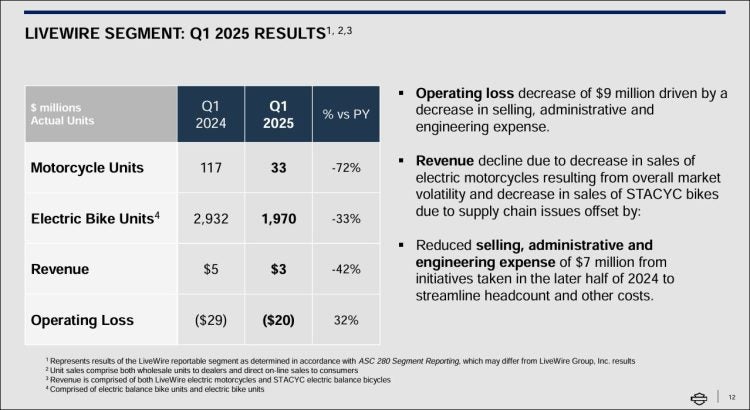 Things were even worse for Harley’s LiveWire electric motorcycle company. In all of Q1 2025, LiveWire managed to sell only 33 motorcycles, down 72 percent from the prior year. Even its kids’ STACYC balance bike business suffered, with sales down by 33 percent. In total for the LiveWire brand, revenue decreased 42 percent to only $3M.
