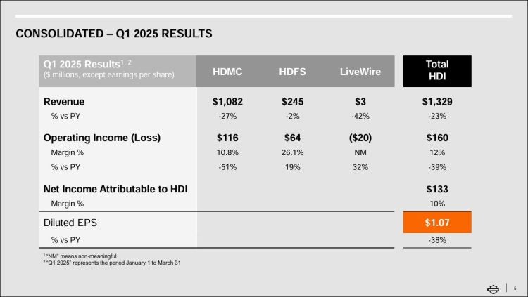 Harley-Davidson released its Q1 2025 financial results, and for Harley-Davidson Motor Company, pretty much all but one financial stat is miserable. Starting with the good news, sort of, the MoCo beat analysts’ earnings per share expectations at $1.07 per share. However, the “beat” earnings numbers are actually down about 38 percent per share from a year ago. That’s about it for the good news.