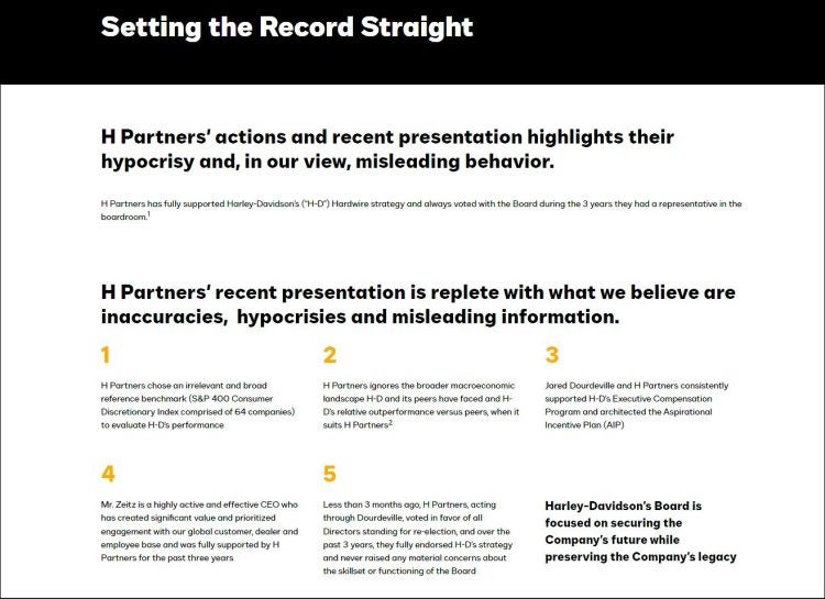 The barrages against each other have been plentiful, so much so that it is getting somewhat difficult to track and determine whose position is the best for shareholders. In this regard, H Partners released an 82-page presentation on what they claim the facts are and suggesting that Harley hasn’t been truthful in its statements. Harley has since shot back at H Partners, “Setting the record straight,” disputing many of H Partners’ representations of events and benchmarks, while touting the experience of the current board.