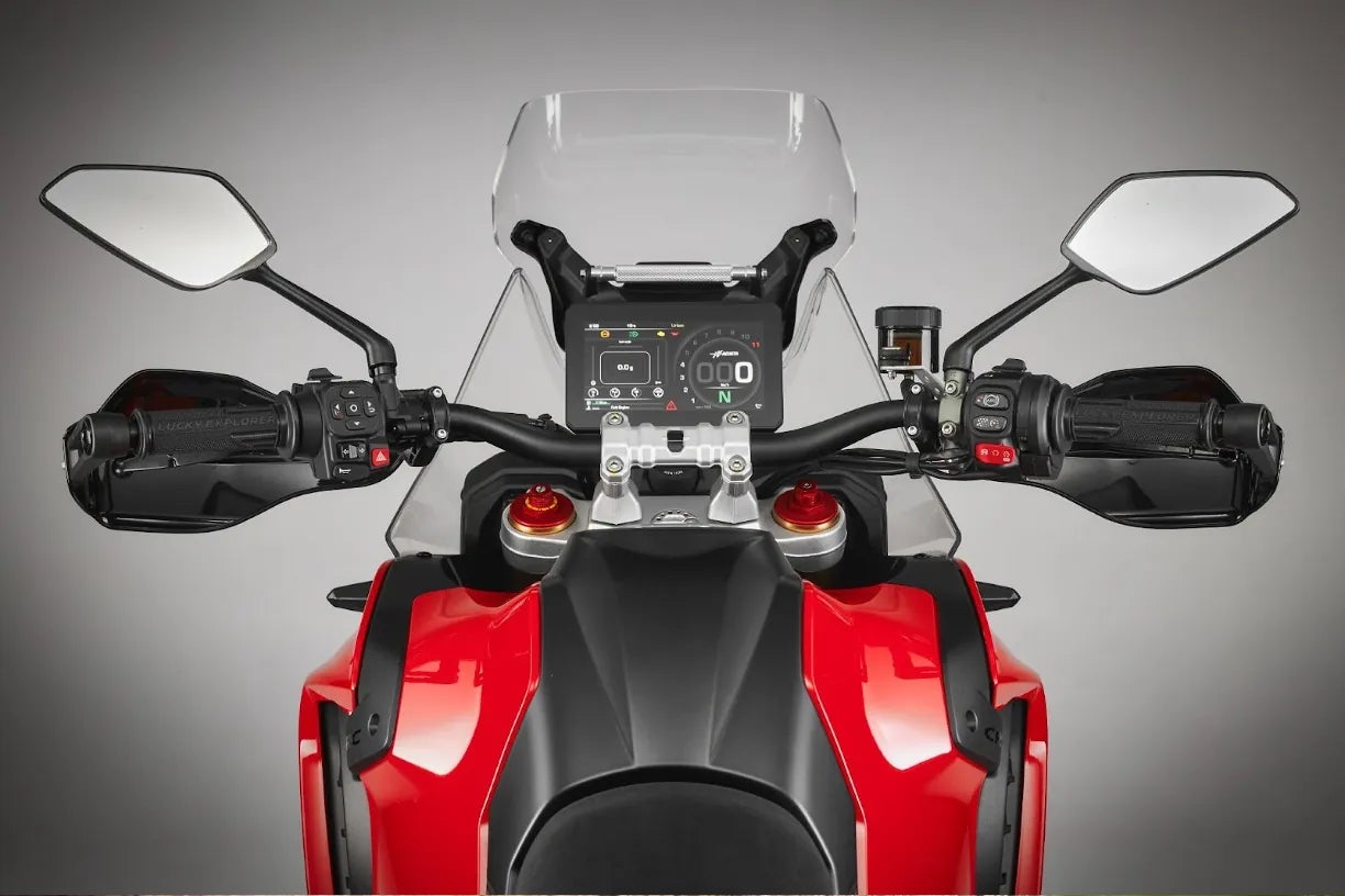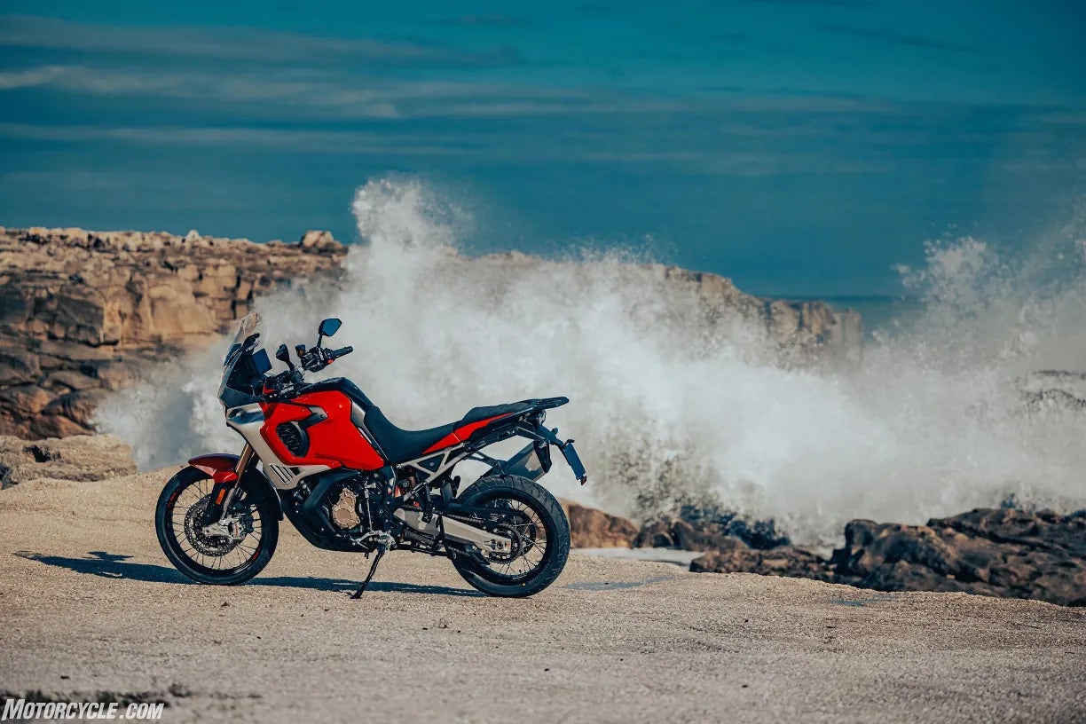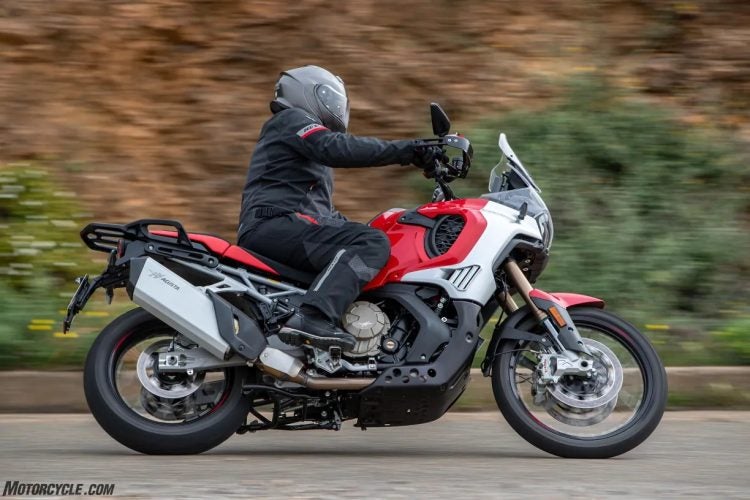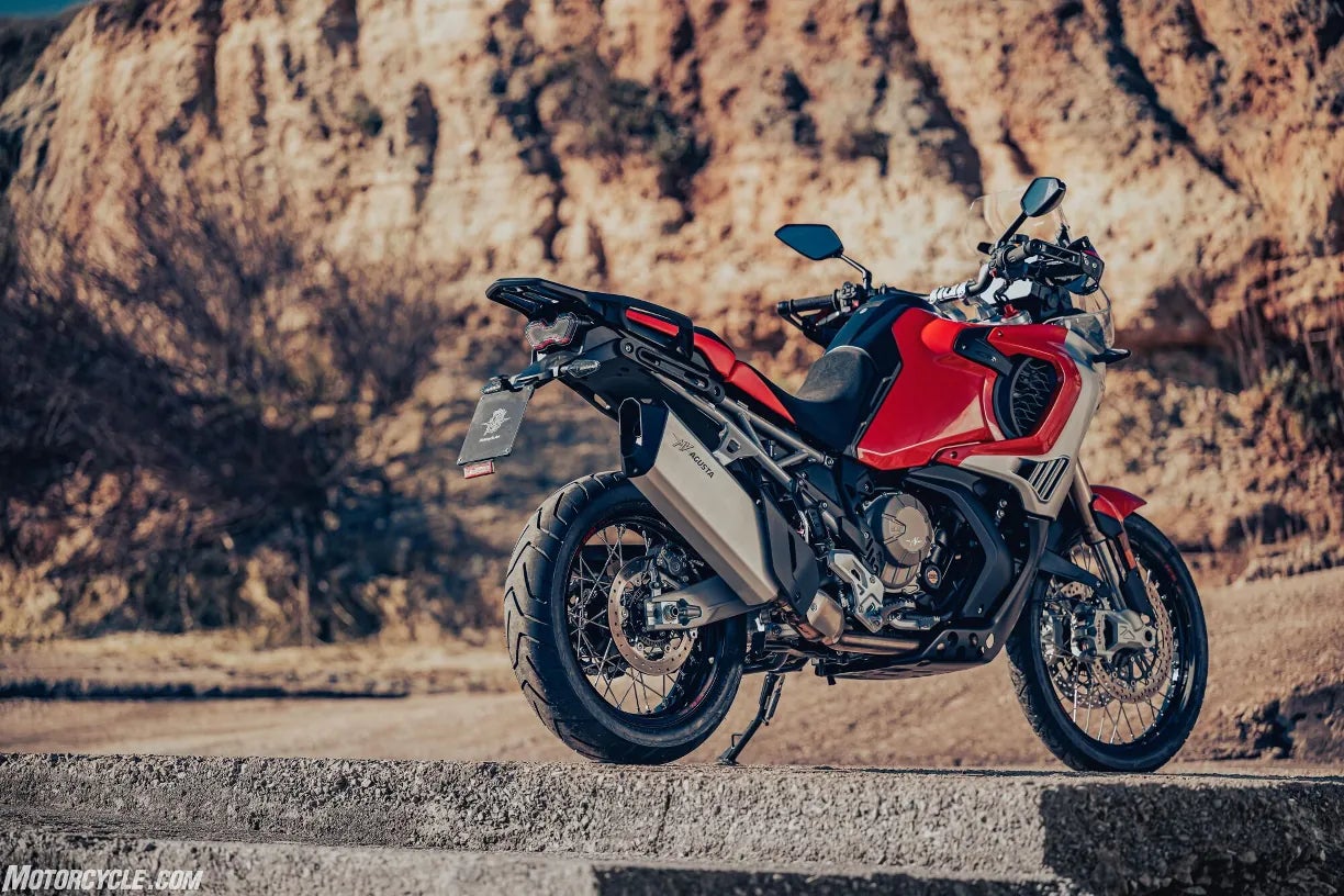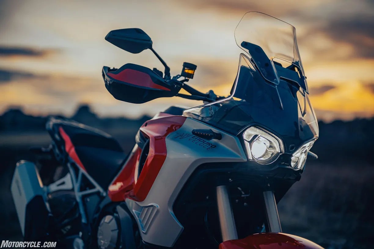 The Enduro Veloce is powered by the same new 931 cc three-cylinder, 12-valve engine found in the LXP Orioli. It produces a claimed 124 hp and 75 lb-ft of torque. MV says 85 percent of that torque is available at 3,000 rpm. The result of those power figures is an MV-quoted 143 mph top speed and a 0 – 62 time of 3.72 seconds.