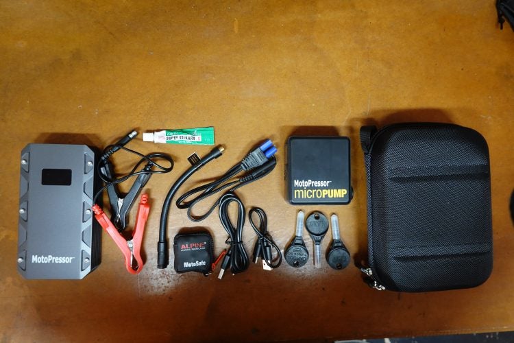Australian accessory supplier Rocky Creek Designs (rockycreekdesigns.com.au) offers various ways of providing air and power and has fulfilment centers in the US and the UK. Out of the range of air pumps, I chose the small MotoPressor MicroPUMP. This is a cordless rechargeable tyre pump which is tiny, measuring 78x35x80mm. The whole kit including hose and cables weighs just 323g.