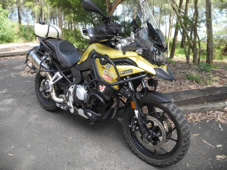The F 750 GS without panniers shows the tidy fitment of the auxiliary tank.