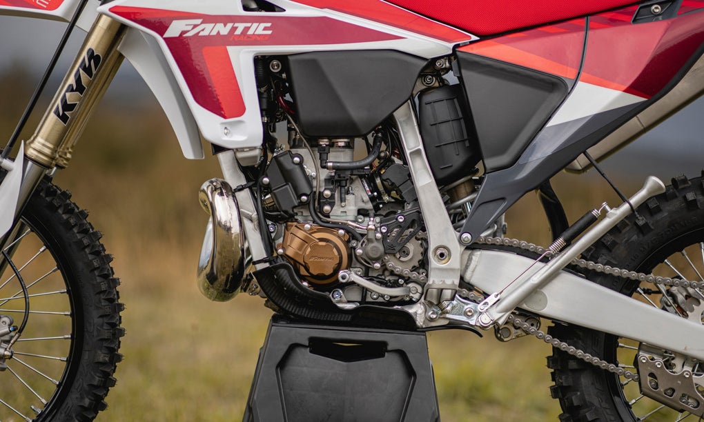 The engine itself is built by Minnarelli, which is owned by Fantic and closely aligned with the Fantic-Yamaha partnership. The two-stroke single is fuel-injected with electric start (no kickstart) and has a five-speed gearbox. It’s supposed to be related to a YZ design. It has an automatic decompression system, with 293 cc capacity, 11.5:1 compression. The clutch is hydraulic, with a Brembo master cylinder. Arrow provides the exhaust.
