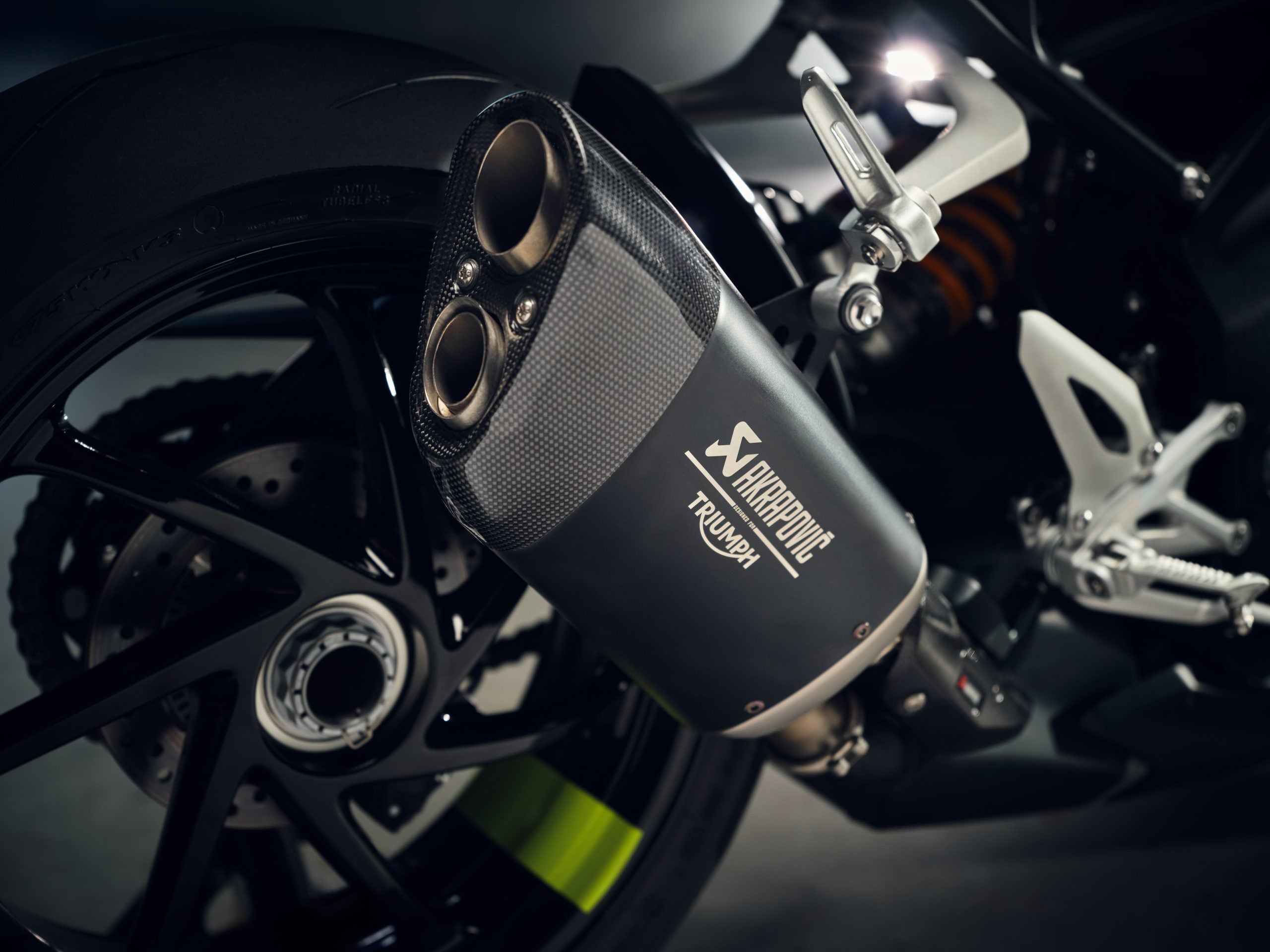 In fact, the limited-edition RX model is one of the most plastic-free nakeds on the market, not just because it has more minimal bodywork than much of the competition, but also because much of that bodywork is made of carbon-fiber, not ABS or fiberglass or whatever they’re making standard fairings from these days. The front fender and some other pieces are made of the lightweight material, but take note that Triumph still claims a 439-pound curb weight for the RX, more-or-less the same as other Speed Triple models, which lends credence to our suspicion that most weight figures published are approximations anyway. Even the Akrapovic muffler, certainly lighter than the stock unit, did not turn this into a Skinny Minnie Miller machine.