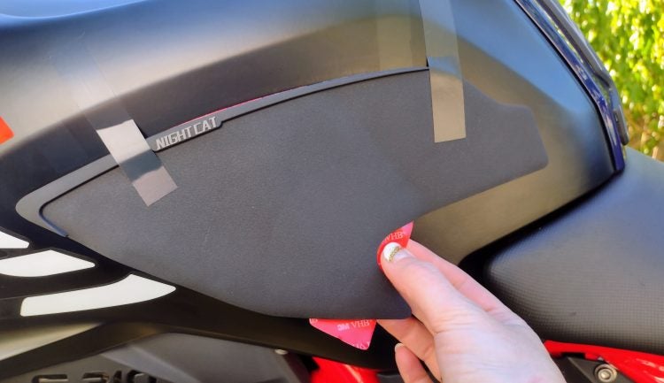 I was already starting to see scuffs in the paint where my jacket zipper makes occasional contact, so tank pads hit the top of the “needs” list. These are “NightCat” from Amazon. They were just shy of $30 USD, and for the price I was surprised by the quality. They feel like heavyweight rubber, and they’re nice and grippy on the tank sides. The center pad protects the tank from my jacket zipper quite nicely.