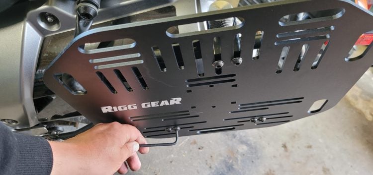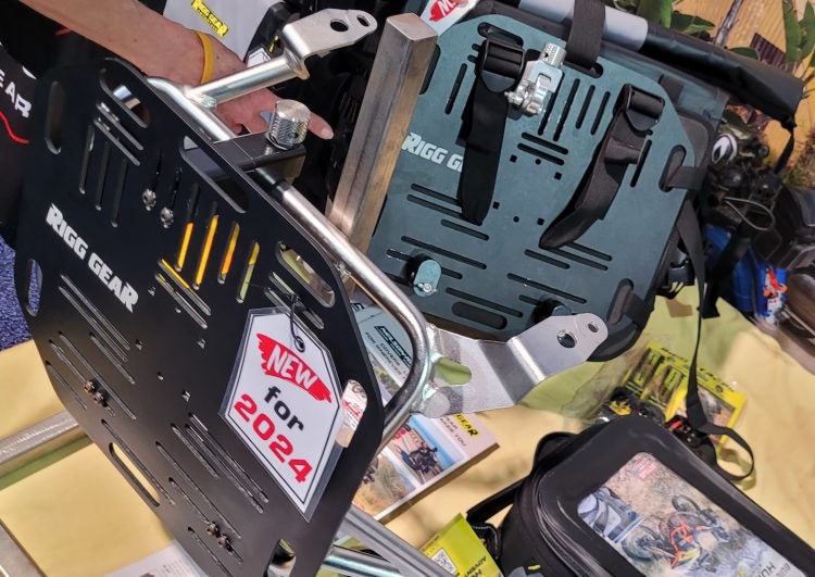 Our initial look at the Nelson Rigg plates came at AIMExpo in 2024. This view of the back of the plates shows how webbing threads through the plates to attach saddlebags. Also note the three mounting clamps; two on the bottom of the plate, one locking clamp on top. Photo: Zac Kurylyk