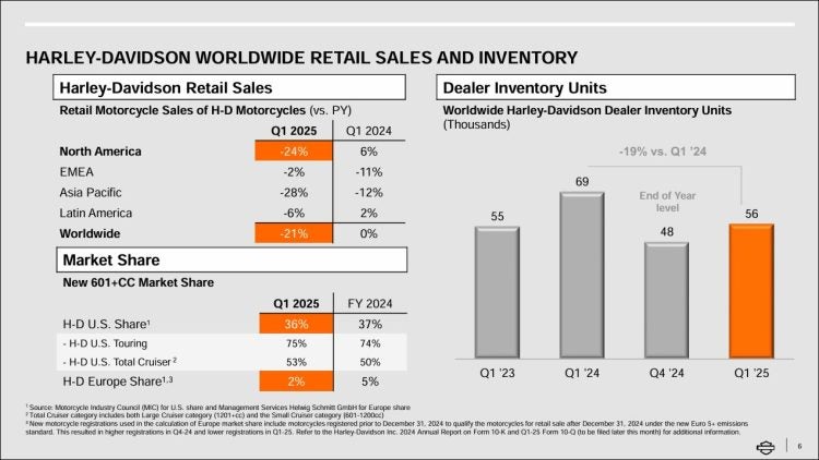 Things were even worse for Harley’s LiveWire electric motorcycle company. In all of Q1 2025, LiveWire managed to sell only 33 motorcycles, down 72 percent from the prior year. Even its kids’ STACYC balance bike business suffered, with sales down by 33 percent. In total for the LiveWire brand, revenue decreased 42 percent to only $3M.