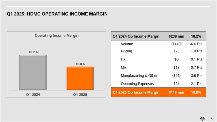 Investors use operating income margin as a way to measure how efficiently a company is being managed. In Harley’s first quarter, its operating margin shrank significantly year over year. In Q1 2024, the MoCo posted an operating margin of 16.2 percent. For Q1 2025, that margin shrank by approximately one-third, coming in at 10.8 percent.