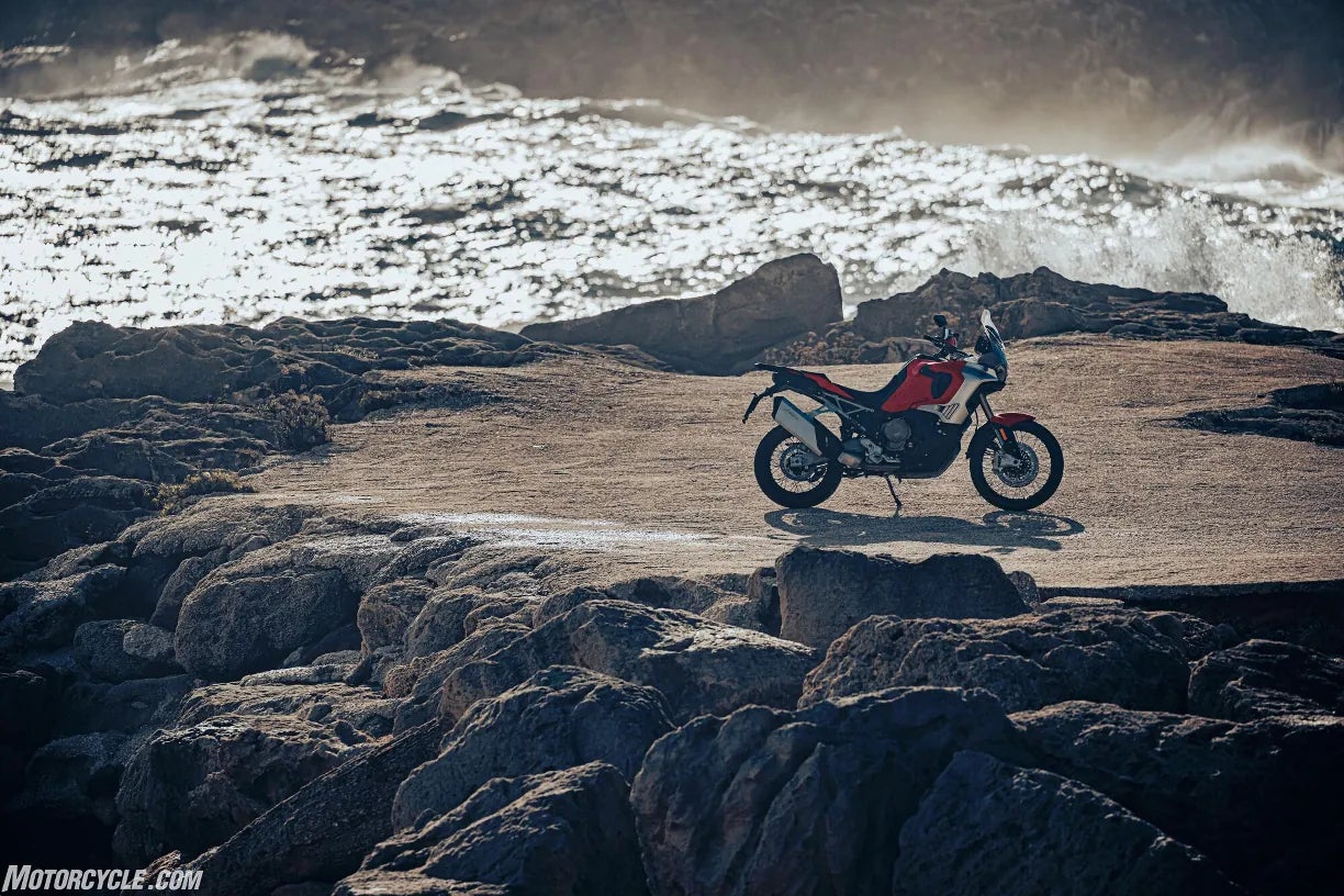 The Enduro Veloce is powered by the same new 931 cc three-cylinder, 12-valve engine found in the LXP Orioli. It produces a claimed 124 hp and 75 lb-ft of torque. MV says 85 percent of that torque is available at 3,000 rpm. The result of those power figures is an MV-quoted 143 mph top speed and a 0 – 62 time of 3.72 seconds.