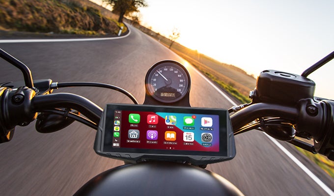 It mounts with a RAM-style ball on the back, which can connect to your bike via claw mount, handlebar mount, steering stem mount, or other option. The 6.86-inch screen offers a wide view, but it’s less bulky than many of the TFTs on the market. Perhaps this is to allow easy access to keyswitch or your bike’s stock gauges? Screen resolution is 1280x480p, with 1000-lumen brightness (auto-darkening as needed).